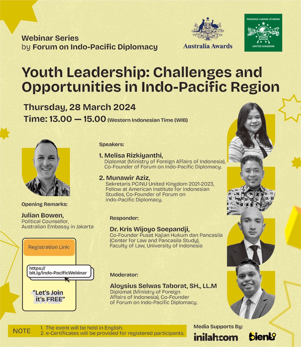 INDONESIA/BRITANIA RAYA – Forum on Indo-Pacific Diplomacy in collaboration with Australian Awards and PCI Nahdlatul Ulama UK is holding a webinar titled Youth Leadership: Challenges and Opportunities in Indo-Pacific Region.